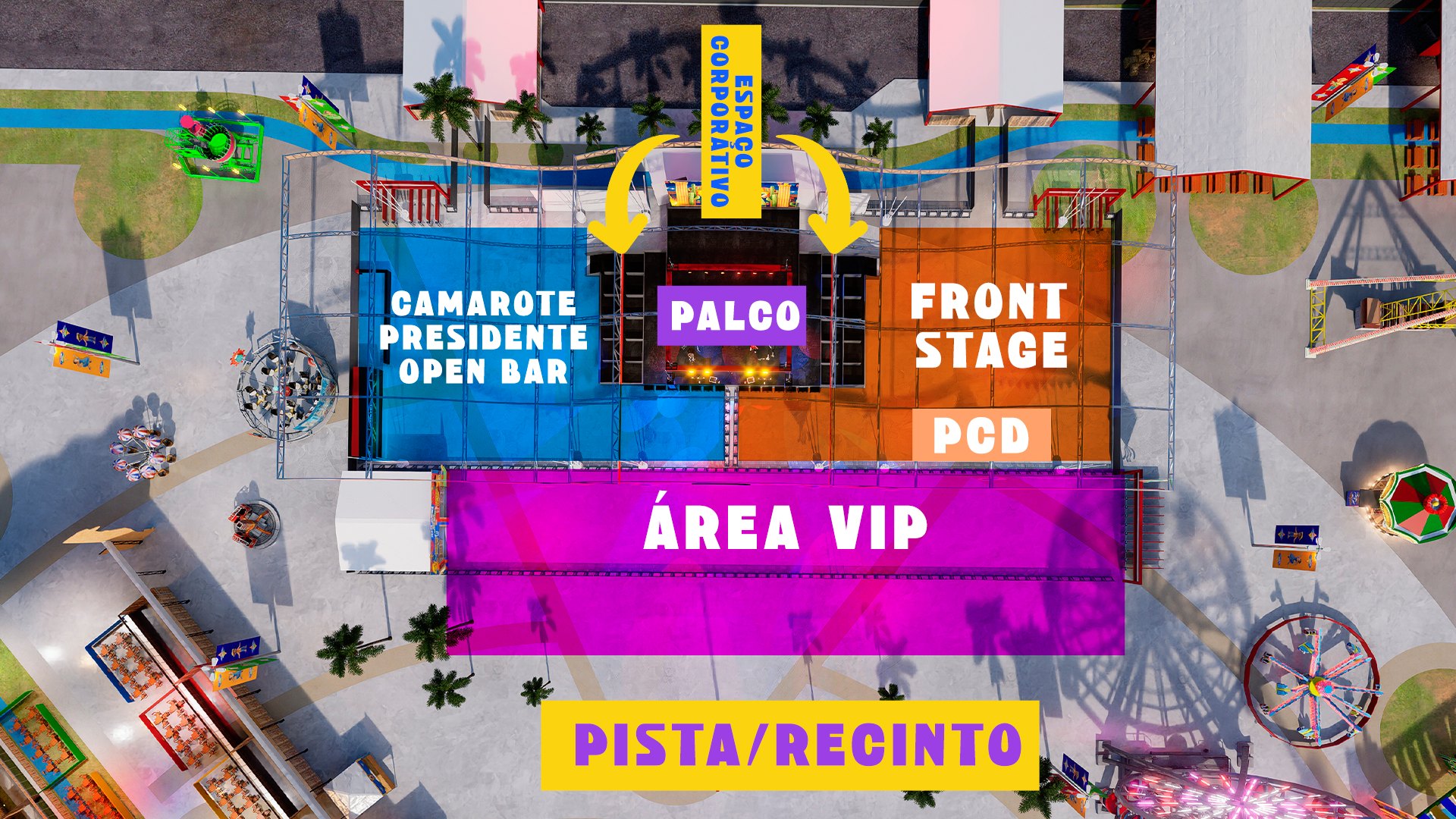O recinto foi cuidadosamente planejado e dividido em setores estratégicos, oferecendo conforto, segurança e diferentes formas de aproveitar a festa.